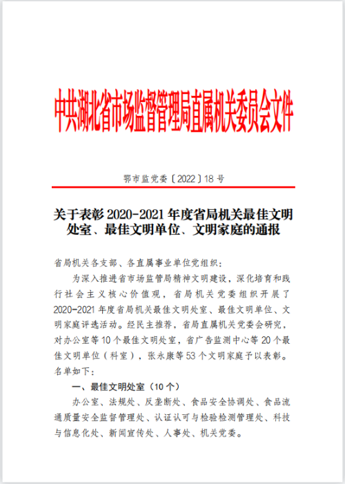 2020-2021 年(nián)度省局機關最(zui)佳文明 處室、最(zuì)佳文明單位、文(wen)明家庭