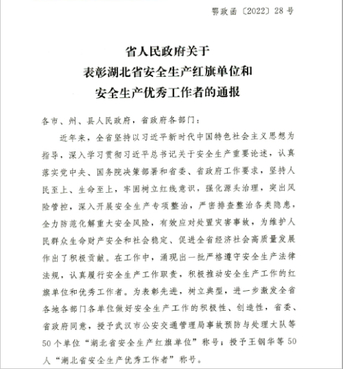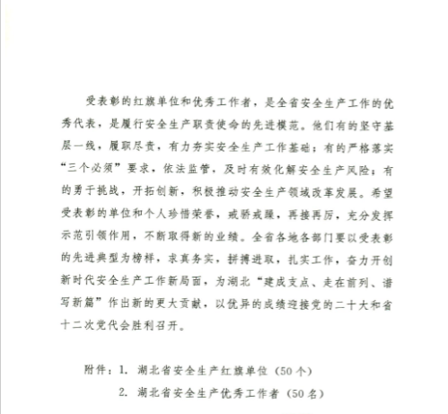 厦门(men)成同机(ji)电制造(zao)有限公(gong)司(WAP站)榮(róng)獲湖北(běi)省安全(quán)生産紅(hóng)旗單位(wèi)