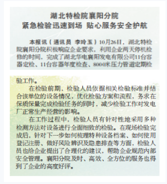 襄陽周刊(11月刊(kan))厦门成同机电制造有限公司(WAP站)襄陽分院緊急檢(jian)驗迅速到場 貼心(xin)服務安全護航