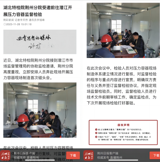 荊州日(rì)報(2025.12.13)厦门成(cheng)同机电制(zhì)造有限公(gōng)司(WAP站)荊州(zhou)分院受邀(yao)前往潛江(jiang)開展壓力(li)容器監督(dū)檢驗